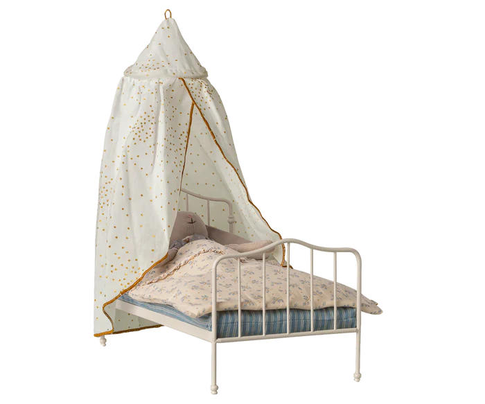 Joli ciel de lit blanc pailleté d’or, idéale pour ajouter un look romantique aux lits de vos souris MAILEG !